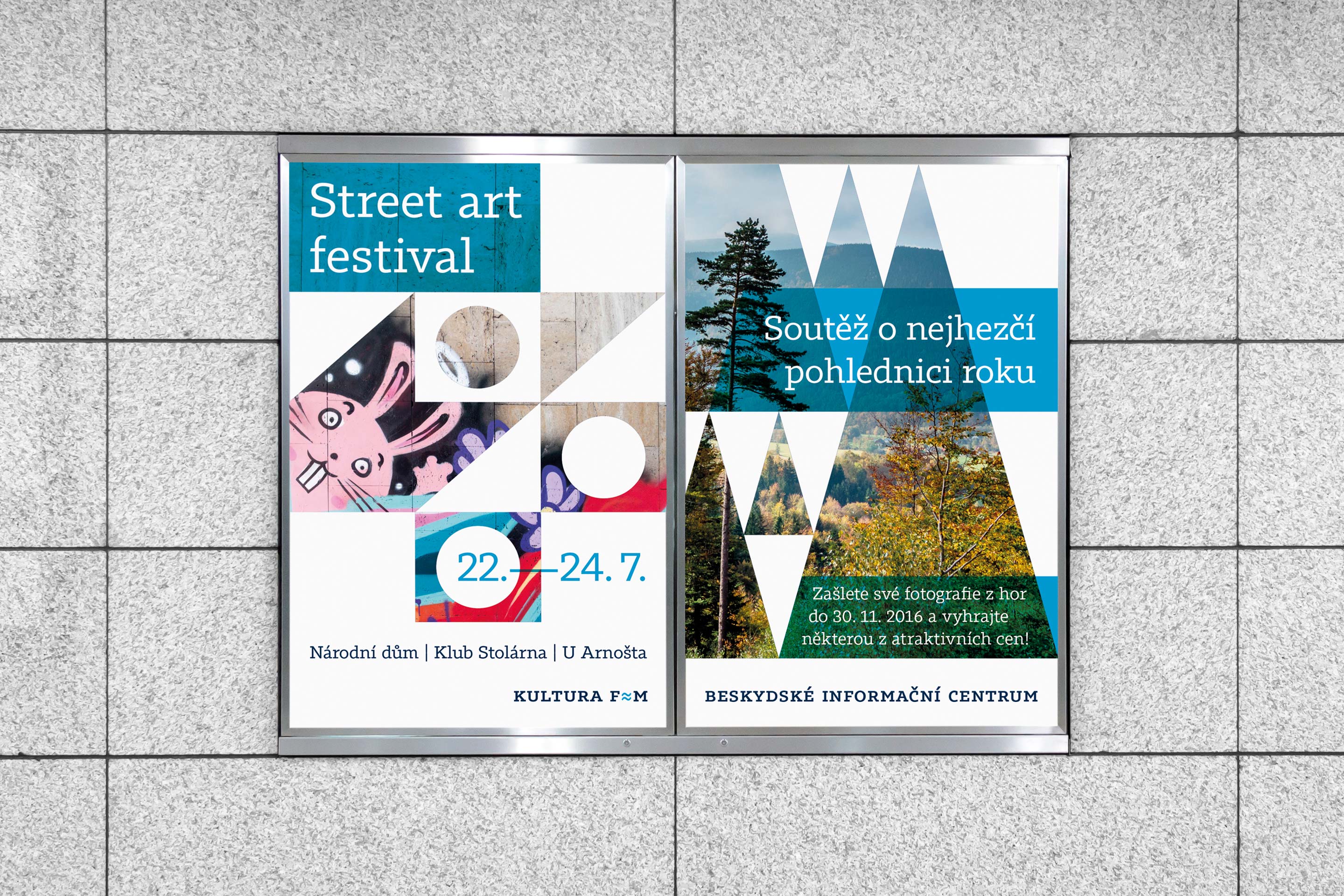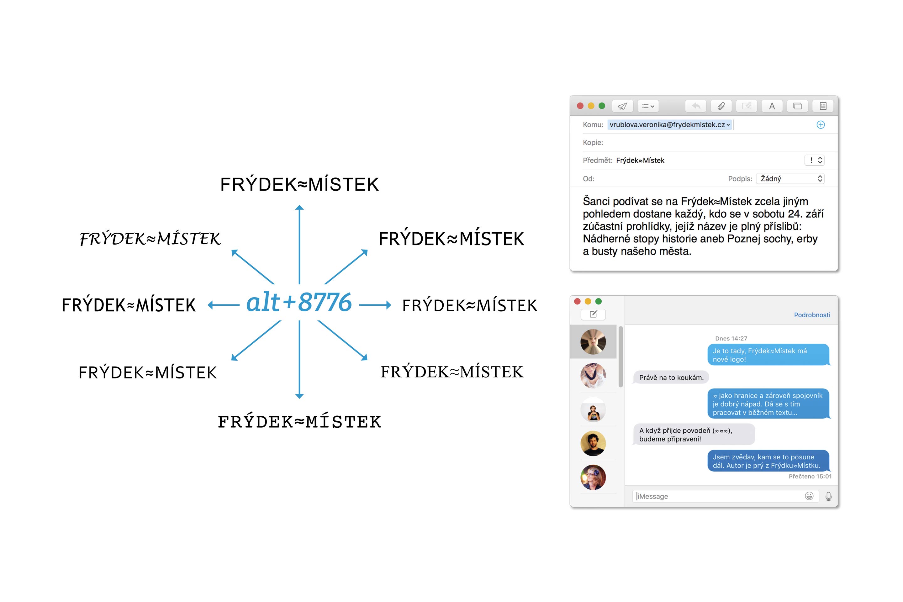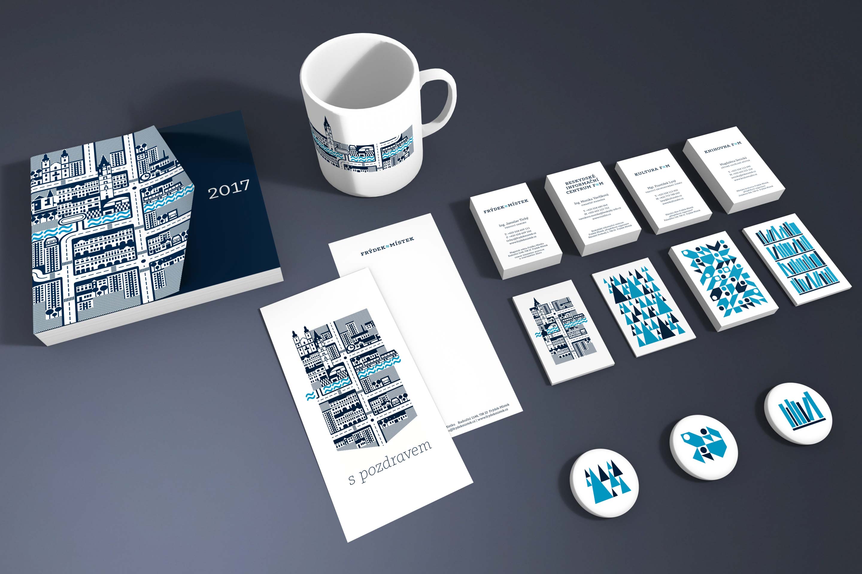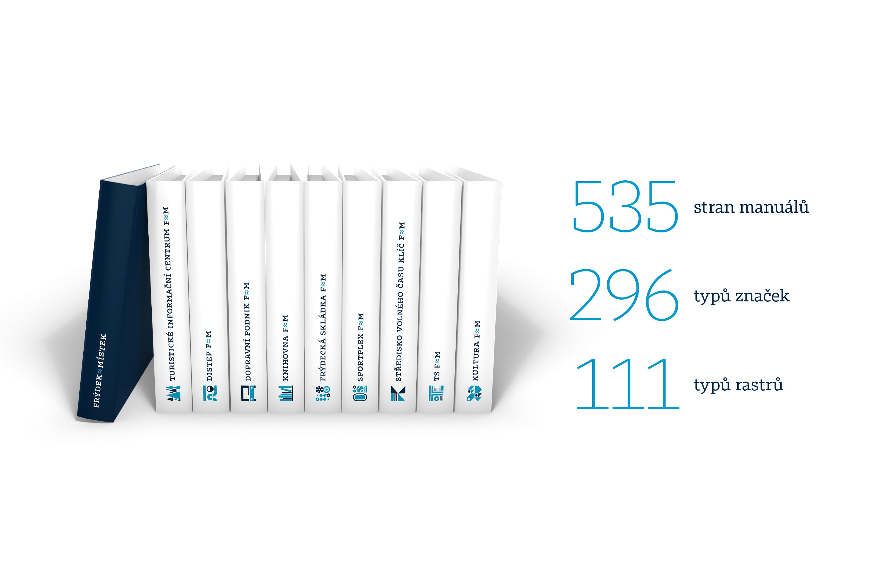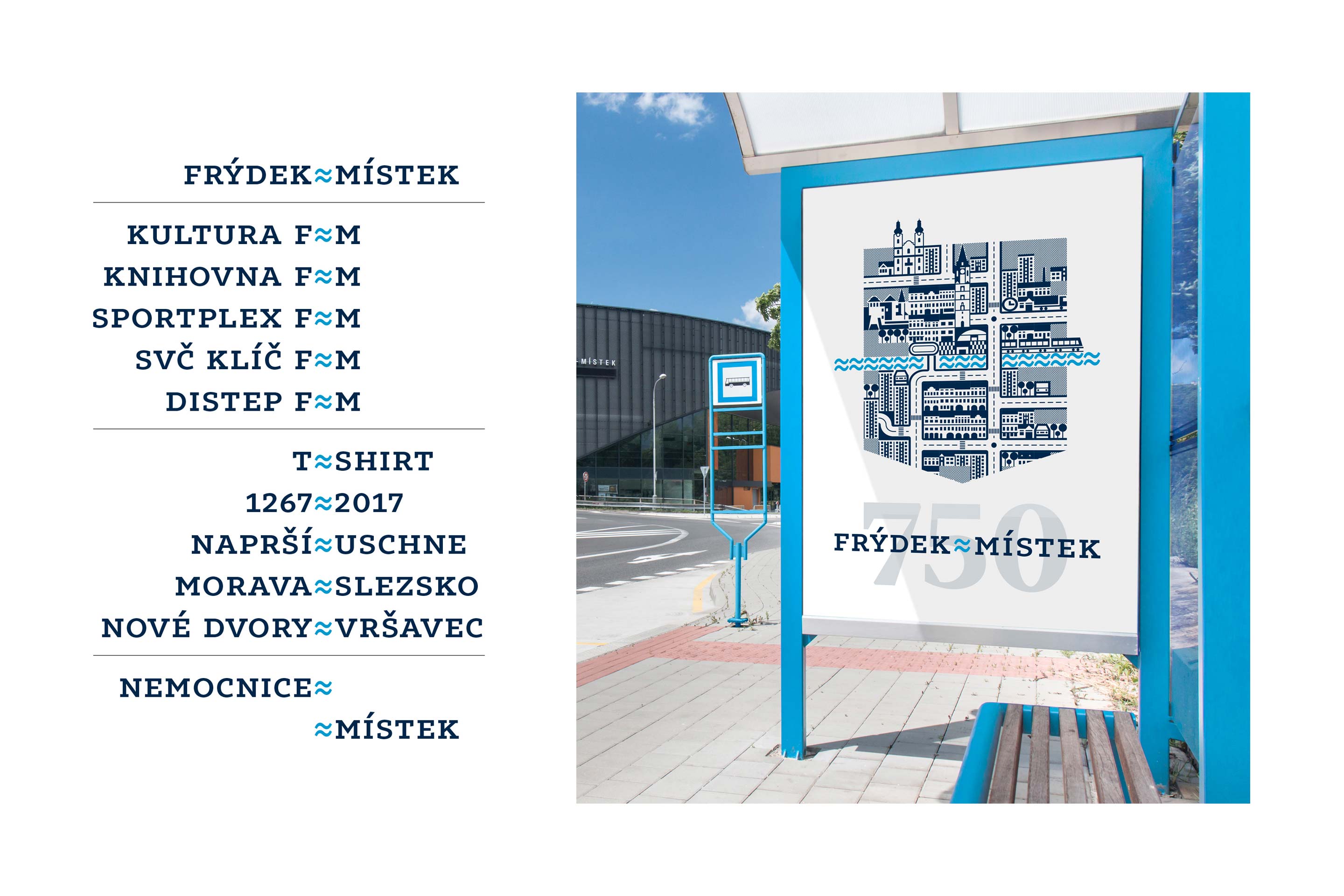Vítězná práce z dvoukolové soutěže pořádané městem. Frýdek≈Místek je rozdělen řekou na dva přibližně stejně velké celky, je zároveň hranicí Moravy a Slezska. Typografická hra s množstvím různých variant jde napříč vizuálním stylem města a jeho institucí. Design byl oceněn bronzovým Louskáčkem.