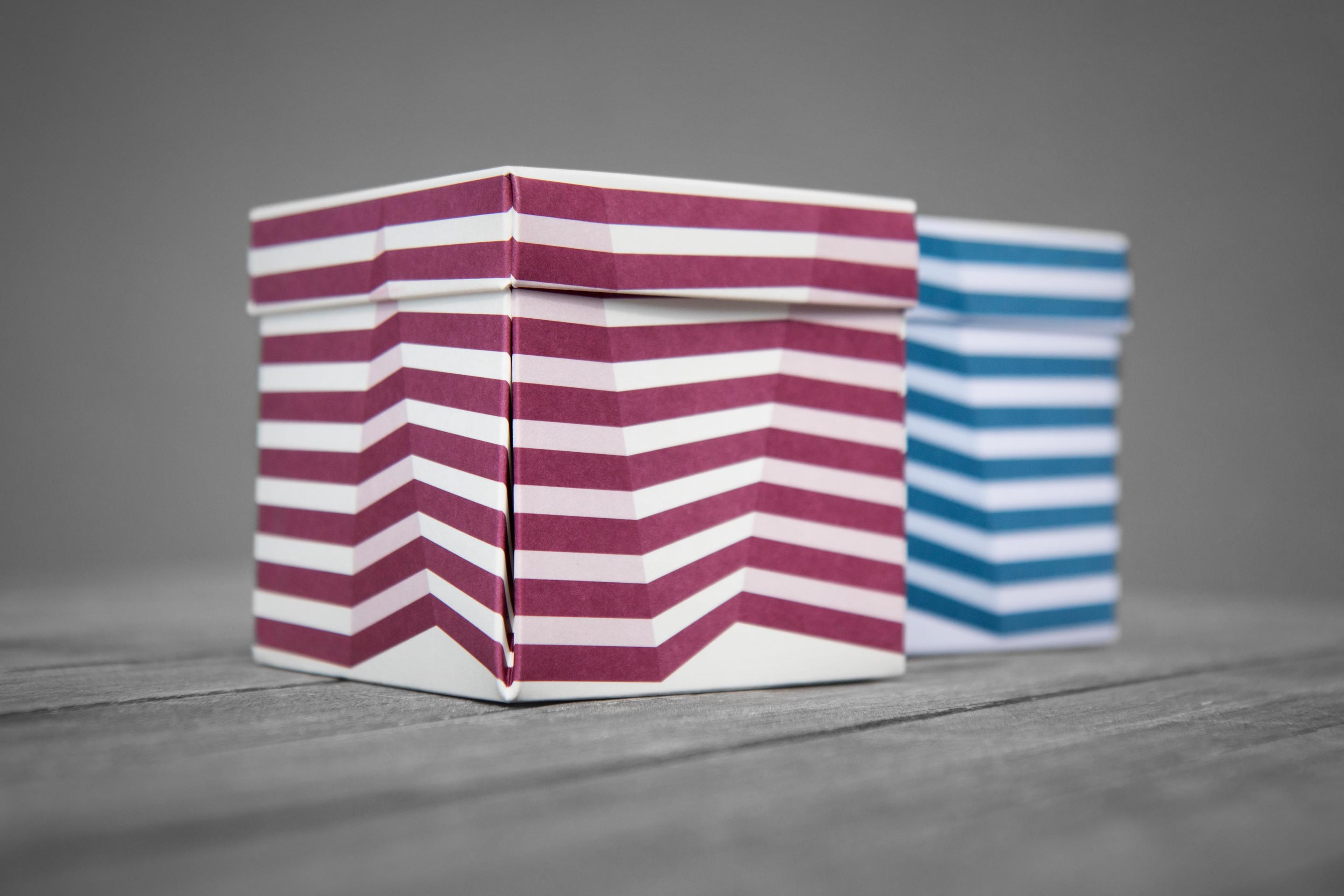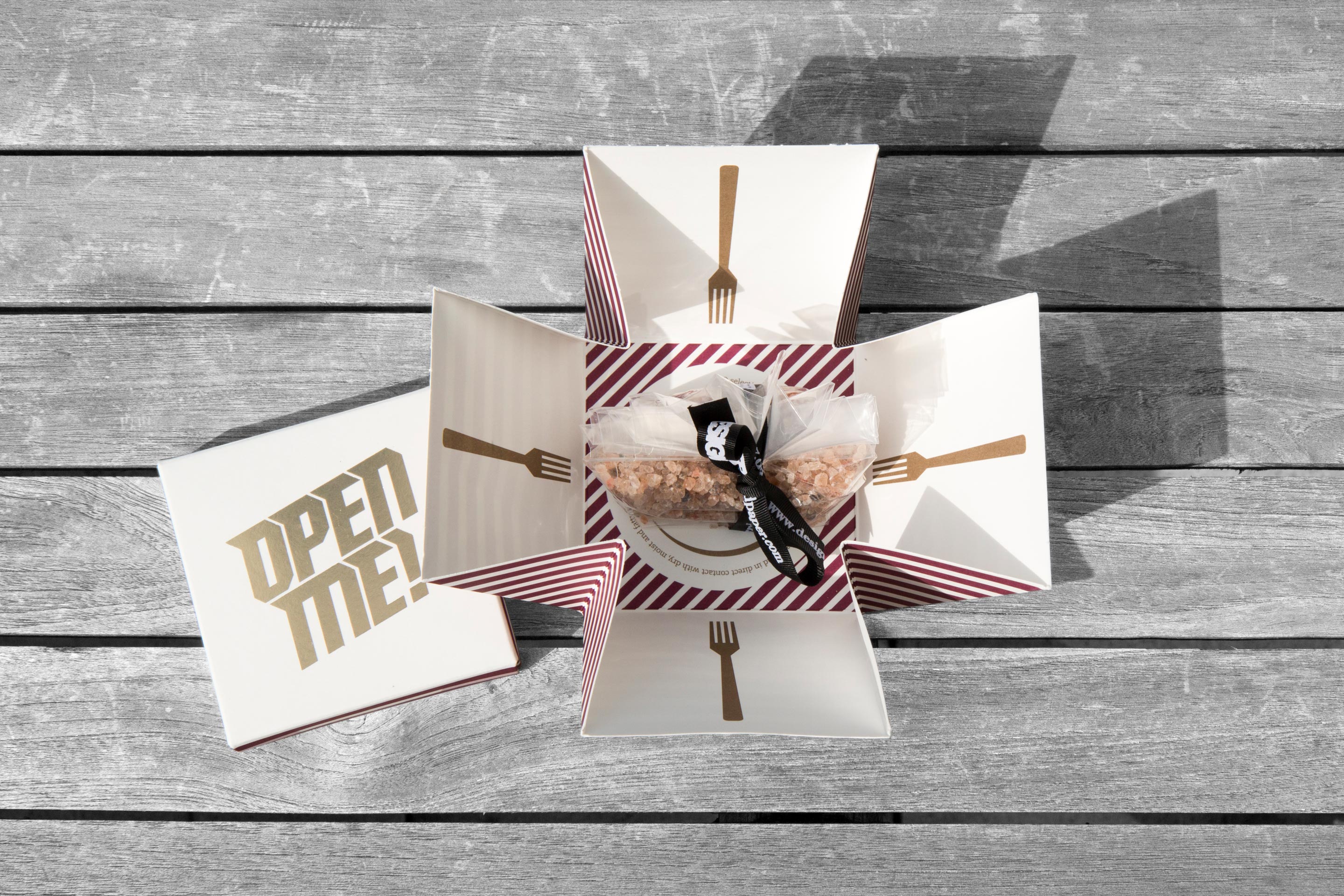 Prolamovaný rastr dárkových krabiček vytváří iluzi nepravidelného krystalického tvaru, graficky navazující víčko je shora raženo horkou folií. Modrostříbrná barevnost si rozumí se studenějším bílým kartonem, červenozlatá pak s krémovým papírem Ivory IQ selection. A co najdete uvnitř? Pytlík kvalitní alpské soli jako pozornost pro zákazníky Europapieru.
