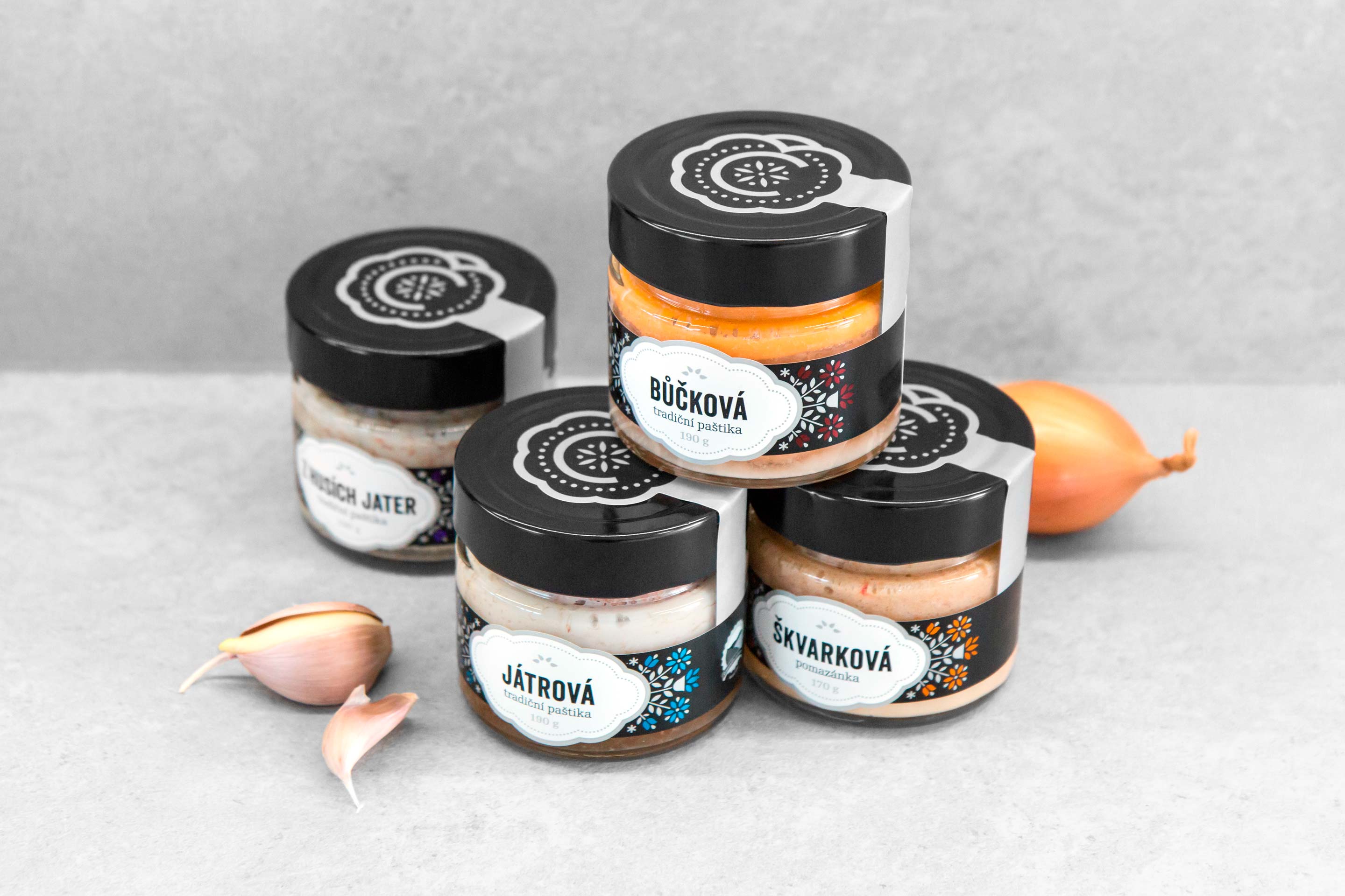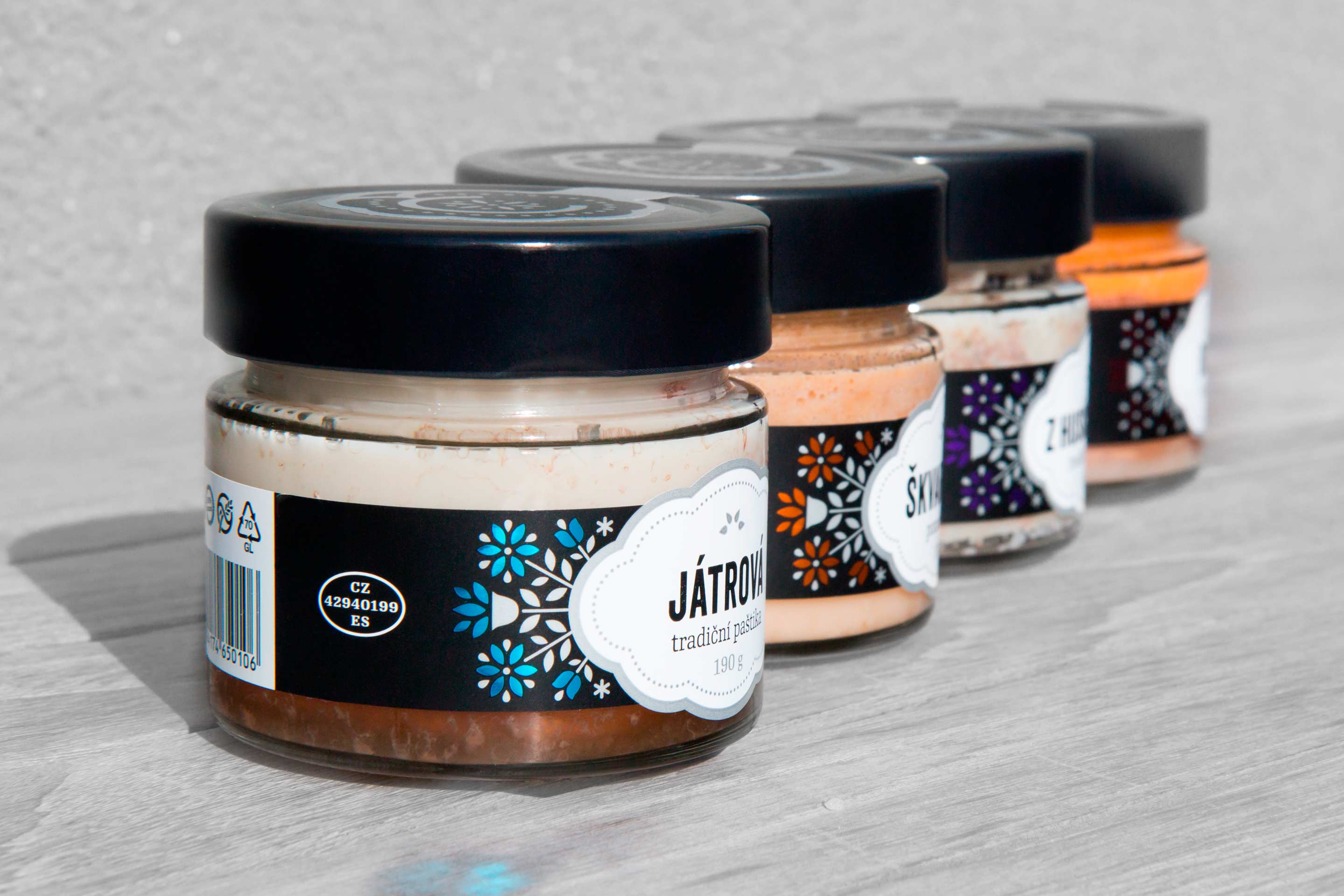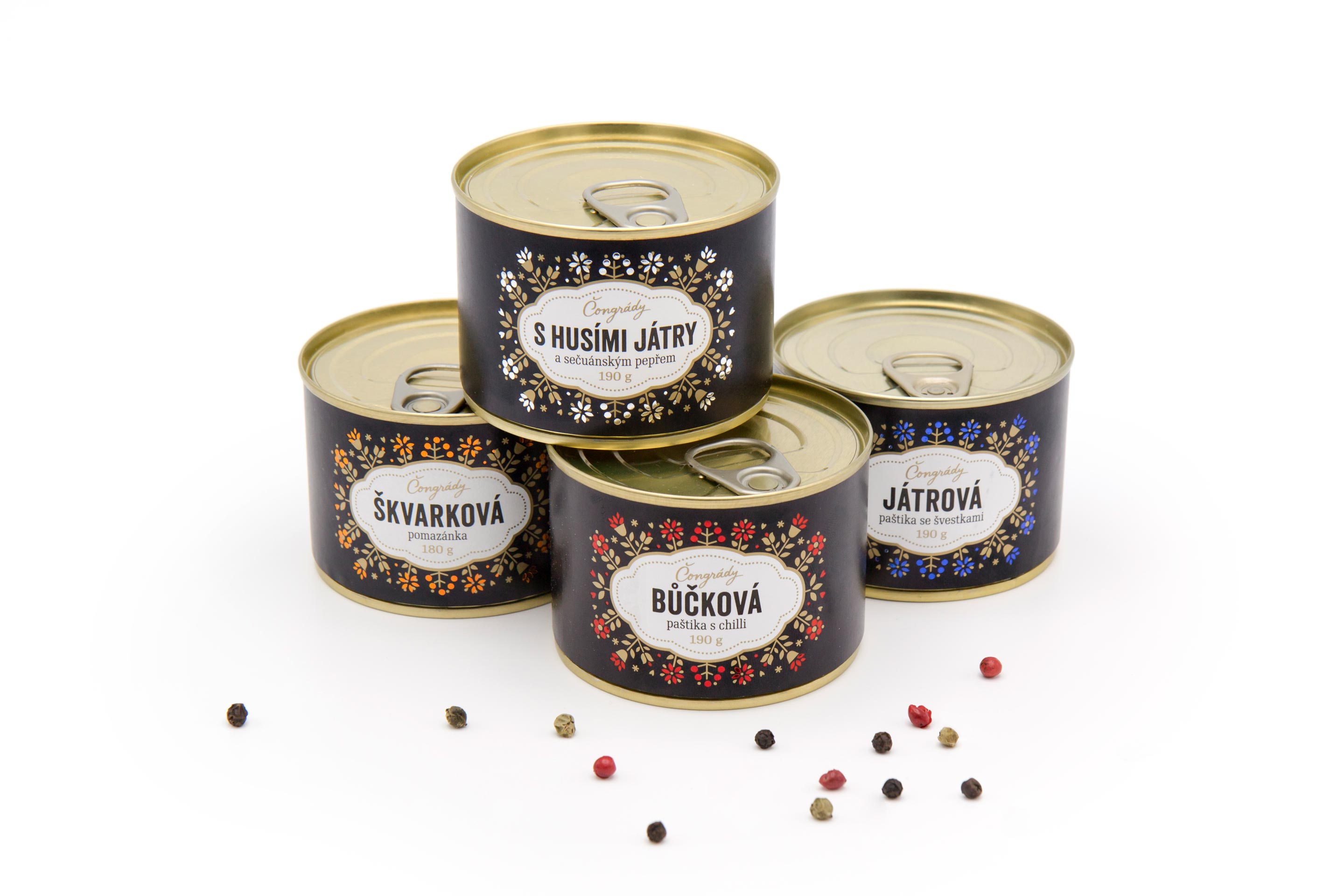 Navrhli jsme řadu klasických i luxusních etiket s metalickými vzory pro řadu kvalitních paštik Čongrády. Logo vzniklo ve spolupráci s písmomalířkou Karolínou Strykovou.