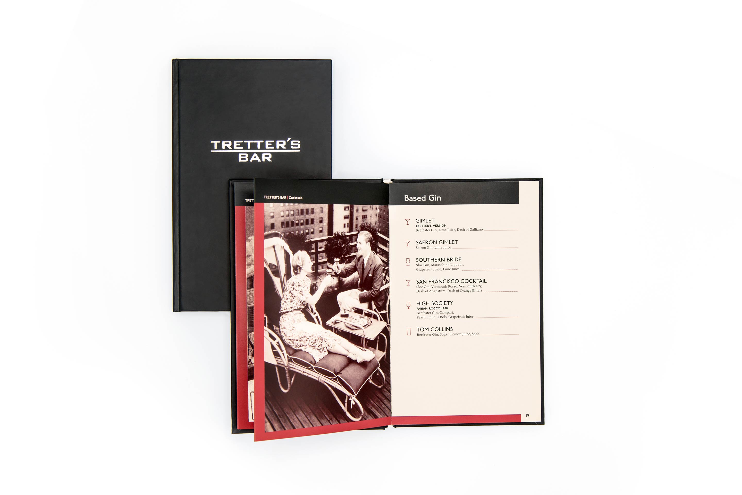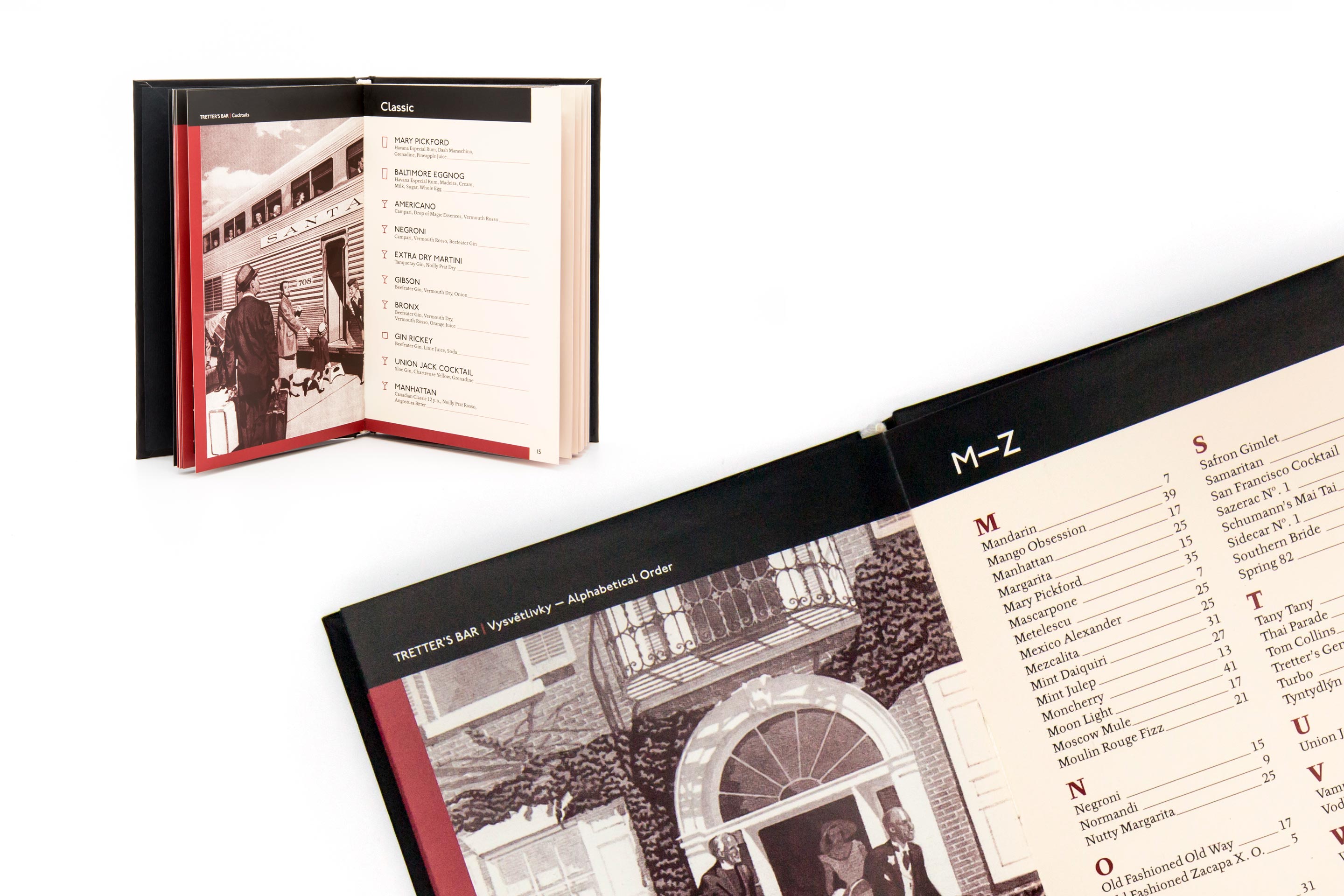 Menu pro známý cocktail bar v Praze. Stylová atmosféra 30. let zachycená v robustní šité vazbě a deskách s metalickou ražbou. Každý drink má u sebe praktickou ikonu sklenice typické pro daný cocktail.