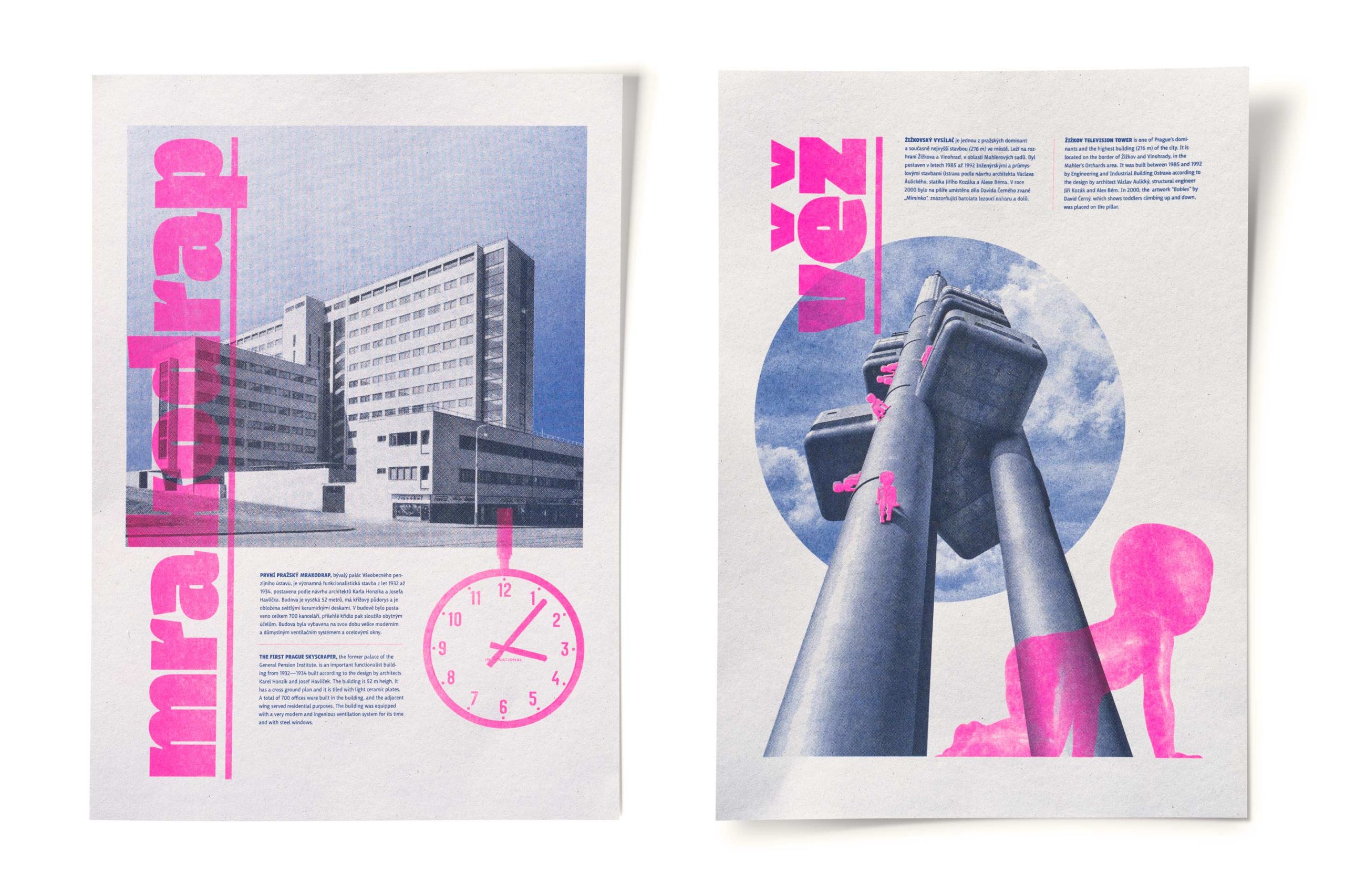 Série pěti plakátů s žižkovskými ikonami vznikla u příležitosti sousedského festivalu Zažít město jinak. Grafika je od počátku navržena pro specifickou reprodukci třemi barvami na japonském stroji Riso v našem studiu. Tisklo se dvěma typy rastrů na hrubý recyklovaný papír. Každý tisk je originál.